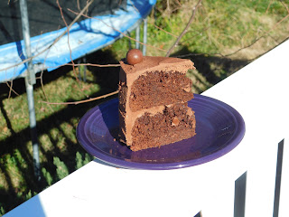 The only problem I had with the cake was actually with the frosting. I found that the frosting wouldn't stick to the cake (I've never had that happen). Finally, I scrapped most of it off, put it back in my mixer, and added very small bits of heavy cream until it was a more familiar texture. I don't know if the recipe just called for too little cream, or if we were having a particularly dry day. Clearly I'll have to remake the cake to find out.